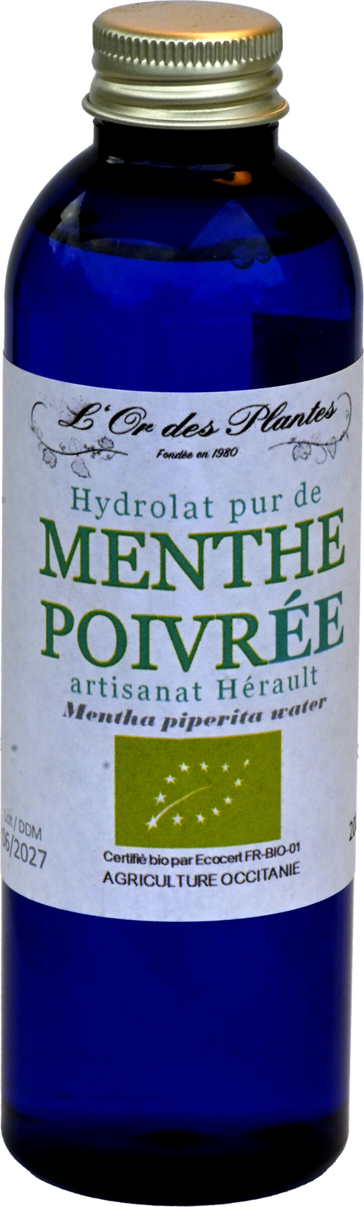 Hydrolat de menthe poivrée bio, petite permacultrice de l’Hérault. Boisson rafraichissante et tonifiante (2/3 c.à s. pour 50cl à boire dans la journée entre les repas). Sur la peau, régule le sébum.