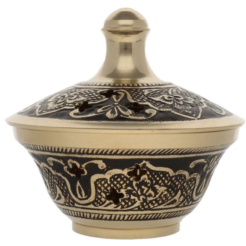 Encensoir en bronze. Artisanat inde. Taille approx. de la pièce : 7 x 7,5cm, 150g env. Peinture motifs noirs.