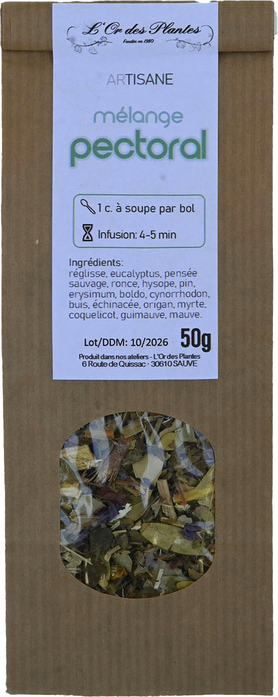 ing: réglisse, eucalyptus*, pensée sauvage, ronce, hysope, pin, erysimum, bouillon blanc, boldo, buis, cynorrhodon*, échinacée*, origan de Provence*, myrte, coquelicot, guimauve*, mauve.