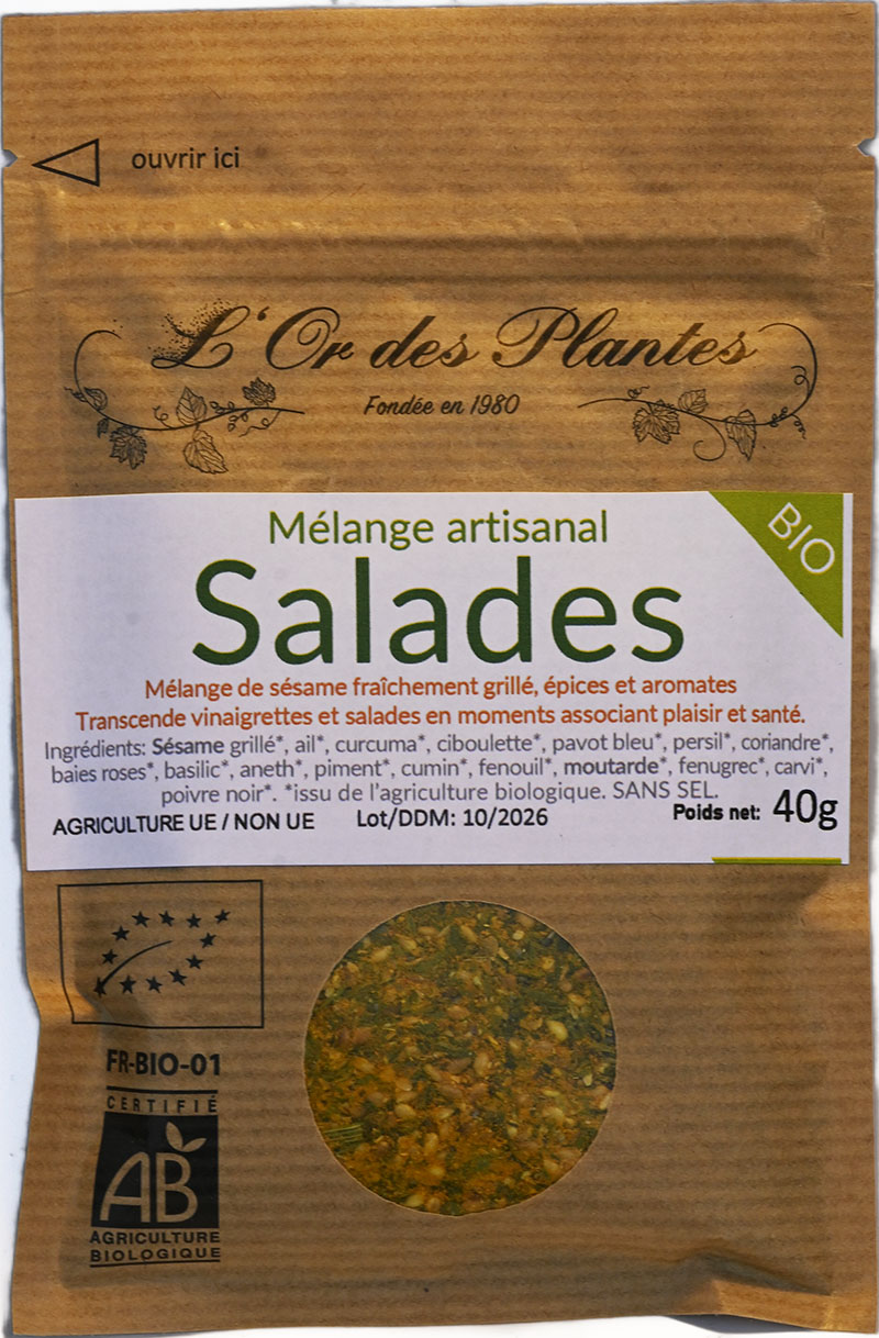 ing: sésame grillé*, ail*, curcuma*, pavot bleu*, persil*, coriandre*, baies roses*, basilic*, aneth*, piment*, cumin*, fenouil*, moutarde*, fenugrec*.
