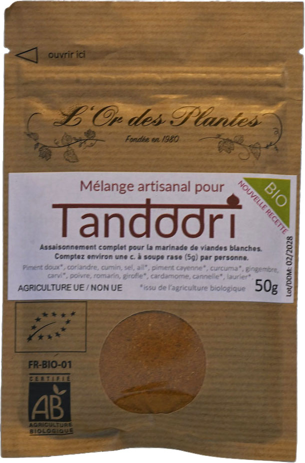 ingrédients: paprika*, coriandre*, cumin*, sel, ail*, curcuma*, gingembre*, poivre noir*, cardamome*, piment fort*, carvi*, girofle*, romarin*; cannelle*, laurier*.