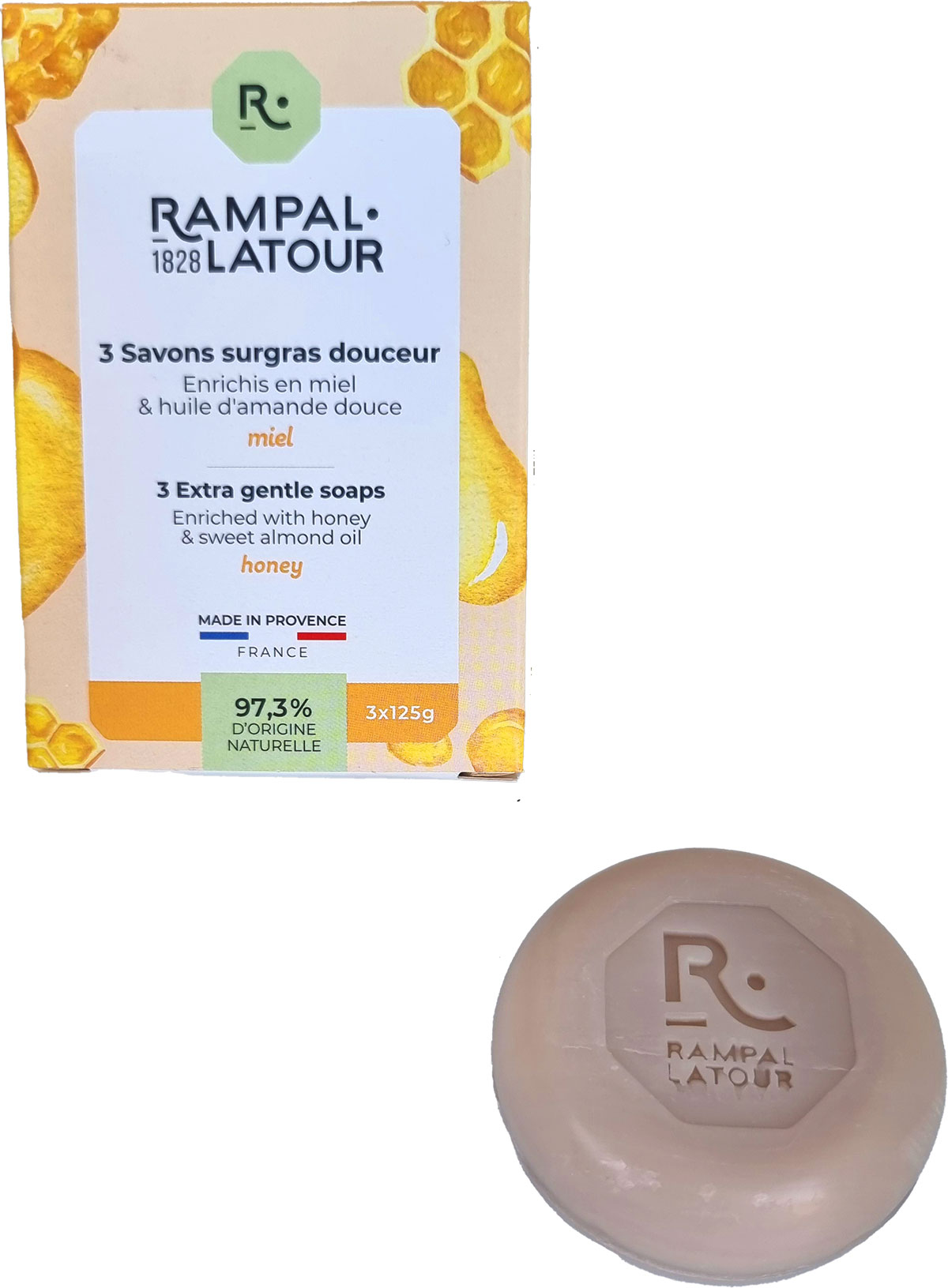 Savonnette parfumée, au miel, à l’huile d’olive et à l’huile d’amande douce. Savon nettoyant surgras, en coffret de 3.