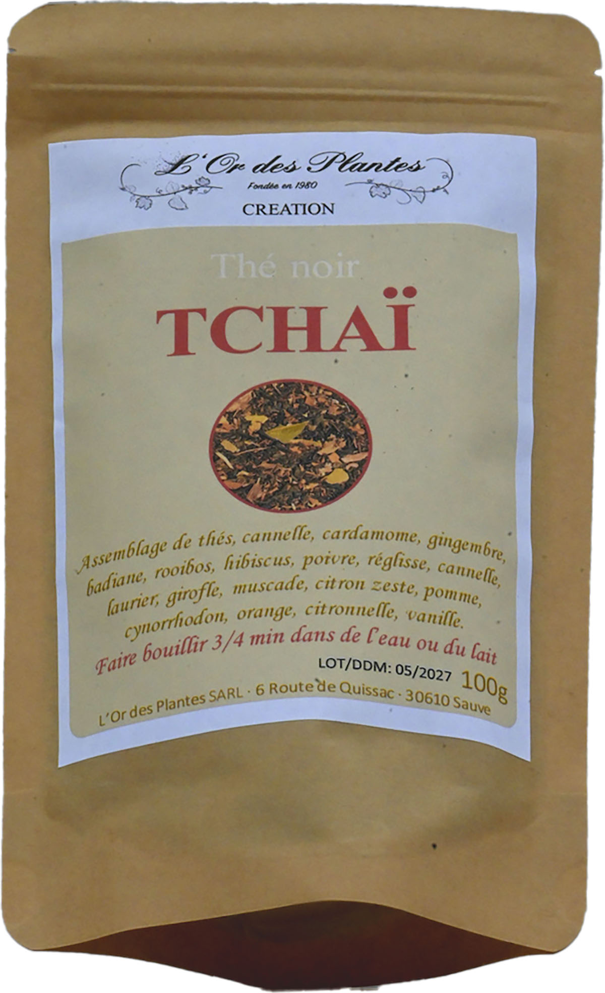 Mélange de thés noirs* avec nos épices: cannelle, réglisse*, rooibos*, citron*, gingembre*, cynorrhodon*, citronnelle, cardamome*, pétales et écorces* d’oranger, poivre, laurier, girofle, muscade*, vanille*, pomme, jasmin.