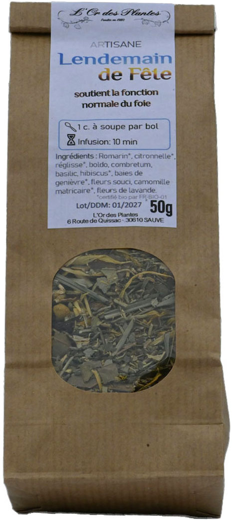 Tisane pour les lendemains de fêtes: romarin coupé, citronnelle*, réglisse*, boldo, combretum, hibiscus, basilic, souci,genièvre, camomille matricaire*, lavande.